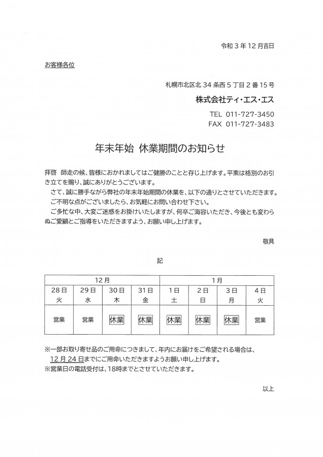 年末年始休業期間の弊社休業日について、以下のように案内させていただきます。